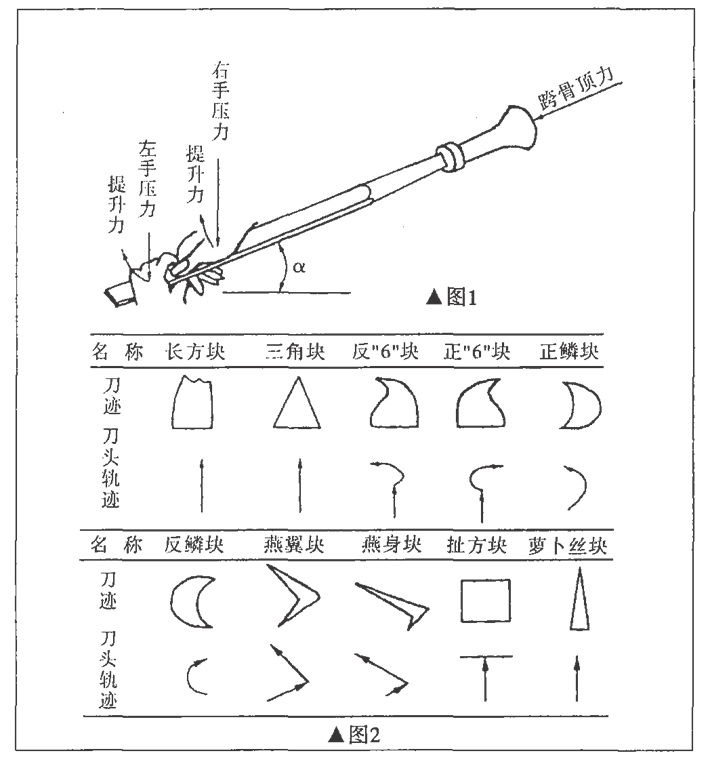 刀跡運作有3種方法,即直推法、直推加扭轉法、左右扭轉法。直推法產(chǎn)生長方塊、三角塊。表面呈現(xiàn)微波形,表面質量較差,適宜粗刮;直推加扭轉法產(chǎn)生反“6”塊、正“6”塊形,表面呈細微波形,表面質量光滑適宜細刮。左右扭轉法產(chǎn)生正鱗塊、反鱗塊、燕翼塊、燕身塊等,表面呈細曲紋波形,表面質量光亮光滑,宜精刮或刮花(圖2所示)。從刮削過程看,刮削是合力作用的過程,操作熟練程度決定了刮削質量的優(yōu)劣。